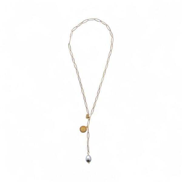 Grauer Tropfen Vergoldete Edelstahl Gliederkette „NIKA“ Gold Exklusiv mit vergoldeter Sonnenmünze Muschelkerntropfen