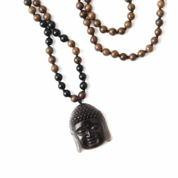 Geknüpfte Buddha Rundhalskette in Braun schwarz mit Achat Buddhakopf aus Sandelholz