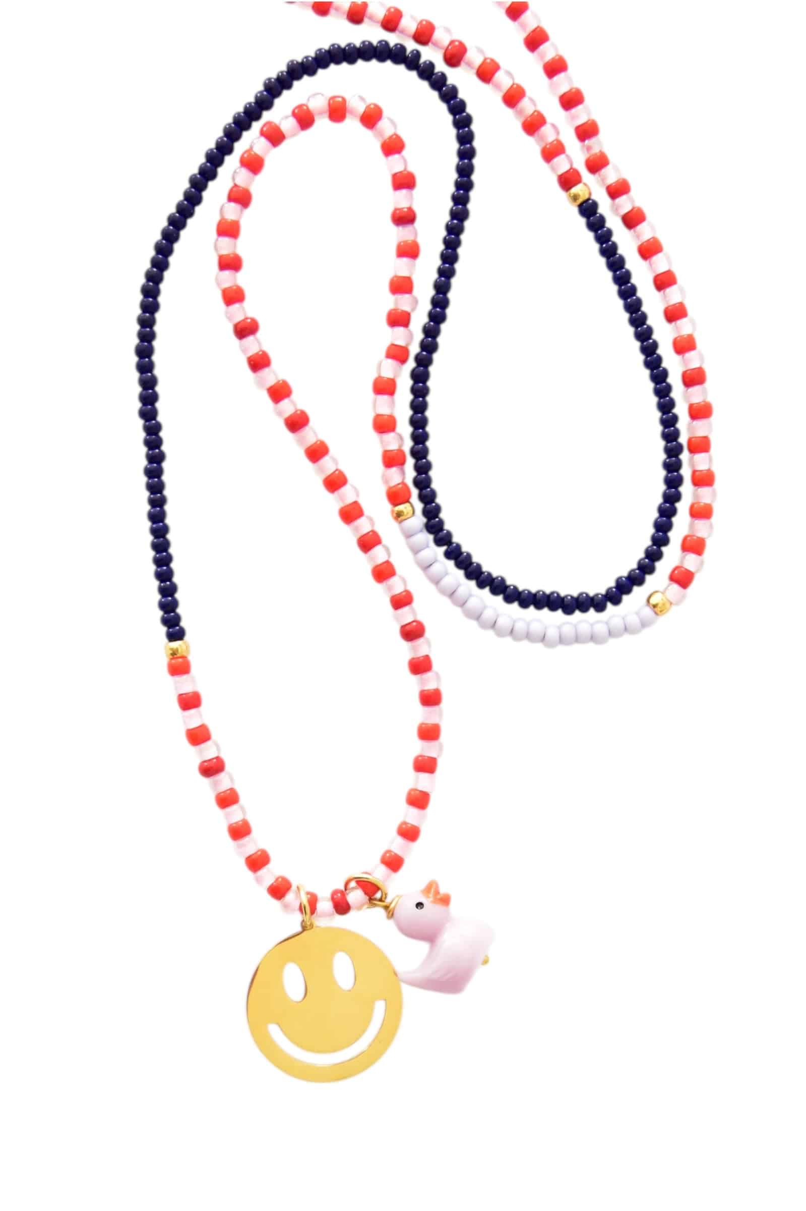 Im Mittelpunkt stehen zwei ikonische Candy-Soul-Charms: ein großer Smiley-Face-Anhänger aus vergoldetem Edelstahl, der für gute Laune und Leichtigkeit steht, sowie eine kleine, fliederfarbene Quietsche-Ente aus Kunstharz, die dem Design einen humorvollen, unerwarteten Twist verleiht.
