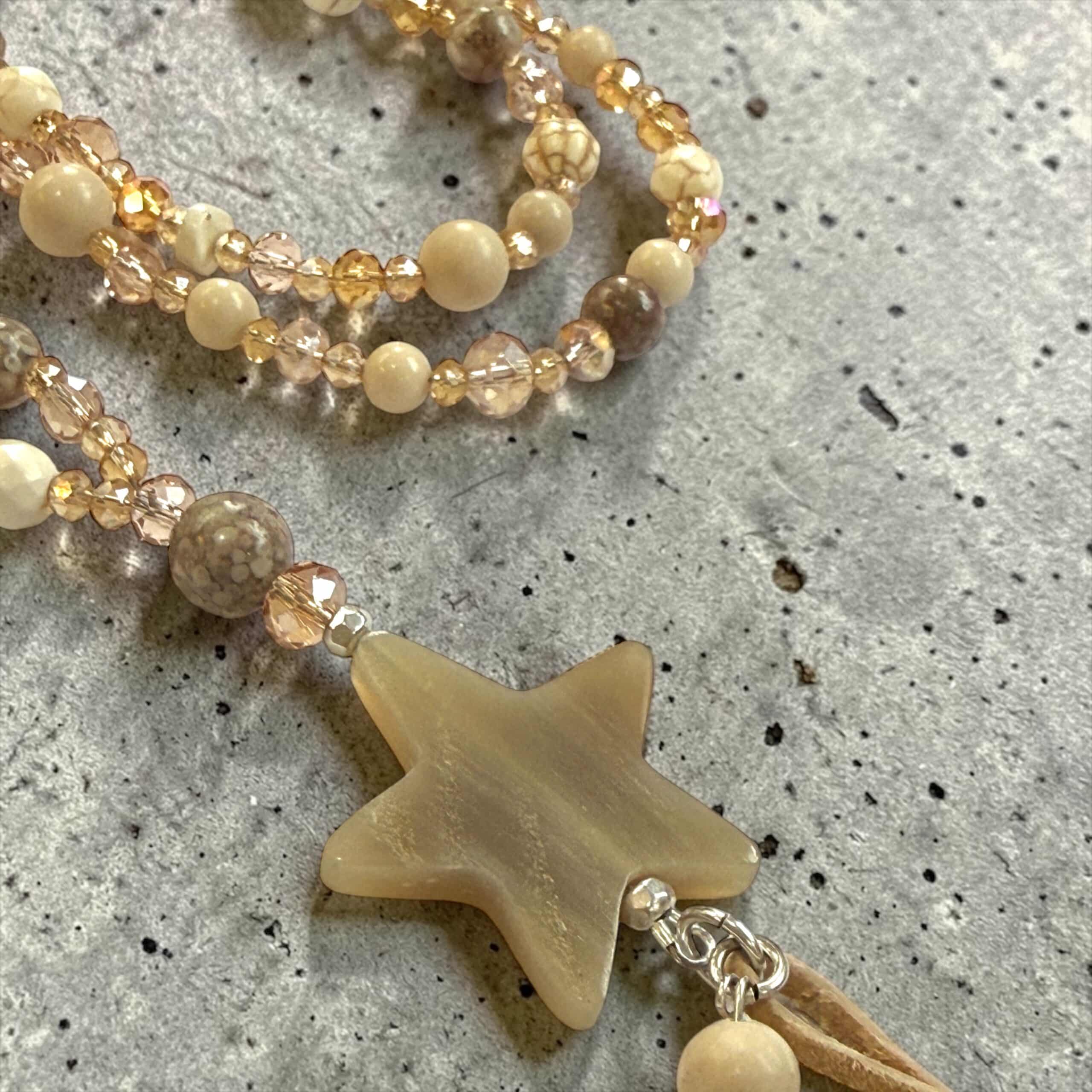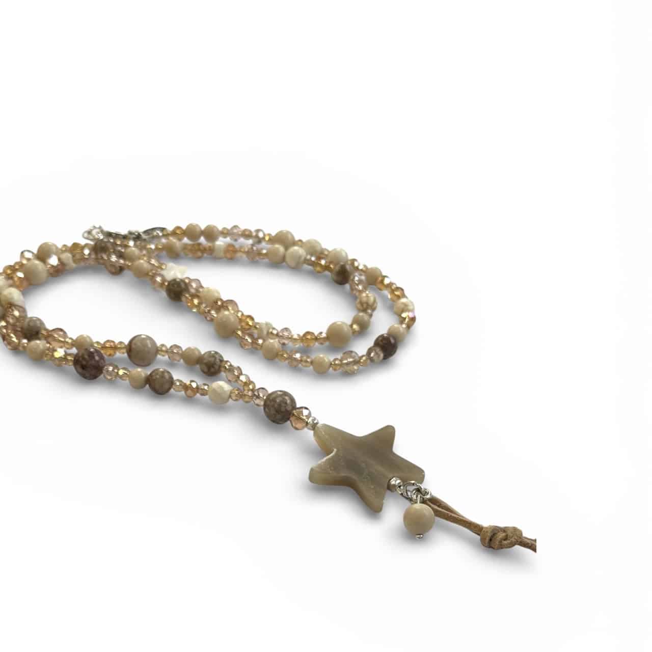 Handgefertigt aus Fossil Jaspis in harmonischen Beige- und Naturtönen, ergänzt durch facettierte Glasperlen, Holzperlen und einen hellen Stern-Anhänger aus Echthorn. Die dezente Lederschlaufe in Naturfarbe unterstreicht das natürliche, lässige Design.