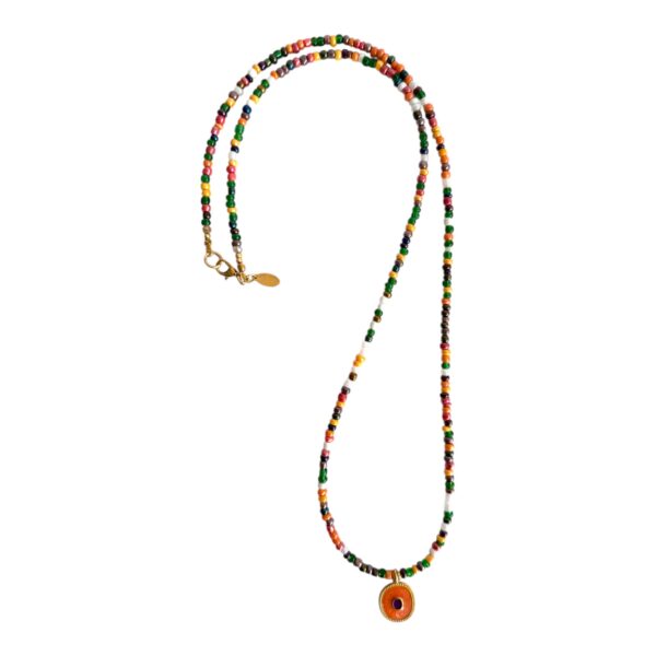 Stilvoller Hingucker aus farblich abgestimmten recycelten Glasperlen , sog. Miyuki Perlen mit einem vergoldeten Medaillon . Die Halskette ist ein wunderbarer Eyecatcher und greift perfekt die Farben eines Outfits in braun, Kupfer , Oliv oder Orange auf.