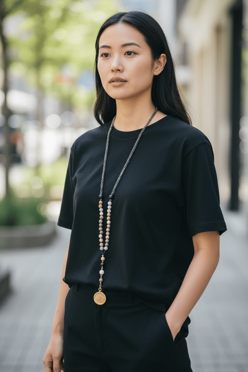 ZeitloseY-Kette mit einem Materialmix aus schwarzem Onyx, kombiniert im oberen Teil mit facettierten Glasschliffperlen in Karamell und Perlmuttelementen, sowie dunkelbraunem Ebenholz. Besonderer Blickpunkt ist eine geschnitzte schwarze Onyxperle, mit „Shou“ (Chou)- Schnitzerei Symbol „langes Leben“