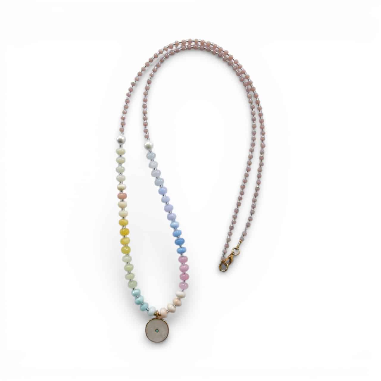 Material: Edelstein Rondelle Rosenquarz, Opal, Amazonit , Jade, 2 weiße Muschelkernperlen, Medaillon 24K vergoldet, japanischem Glas, mit einem runden Medaillon (Emaille und 24K vergoldetes Altsilber)