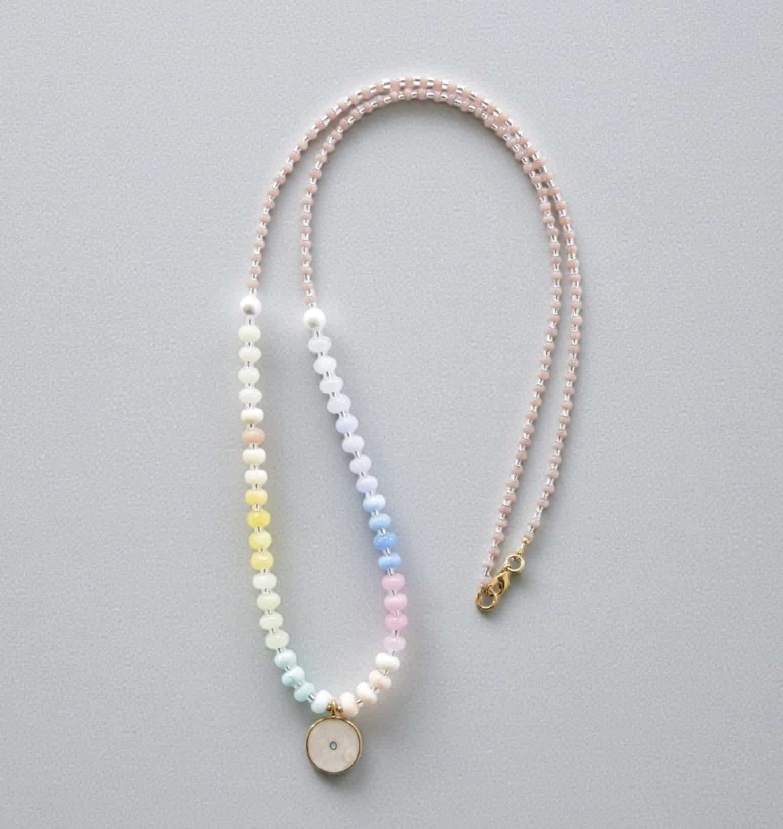 Stilvoller Hingucker aus zarten farblich abgestimmten Edelsteinrondellen und japanischem Glas, mit einem runden Medaillon (Emaille und 24K vergoldetes Altsilber).