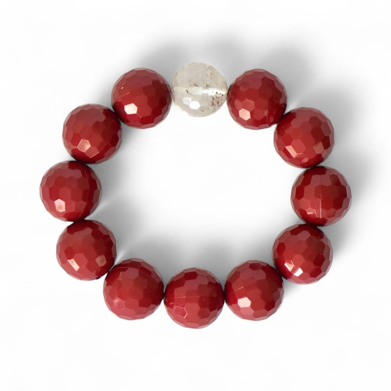 Unser elastisches Kugelarmband in Rotbraun kombiniert hochwertige, facettierte italienische Polymer-Perlen in edler Edelstein-Optik mit einer echten, facettierten Bergkristallkugel als funkelndem Highlight.