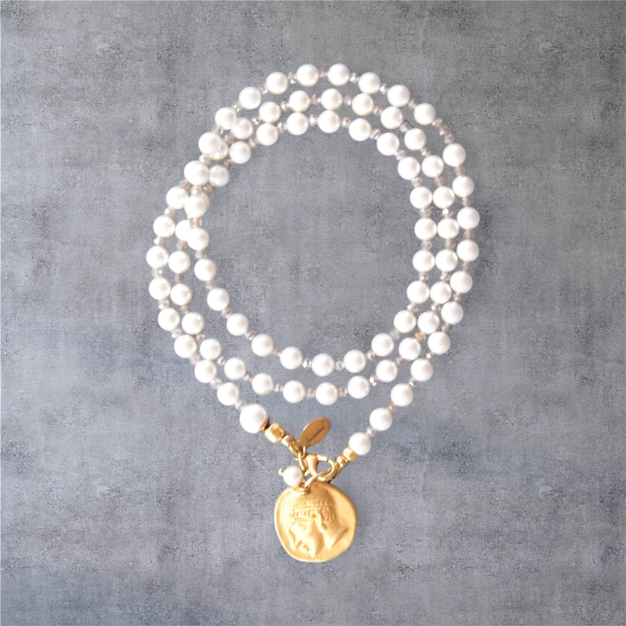 Materialien: Muschelkernperlen, vergoldete Elemente und Münze