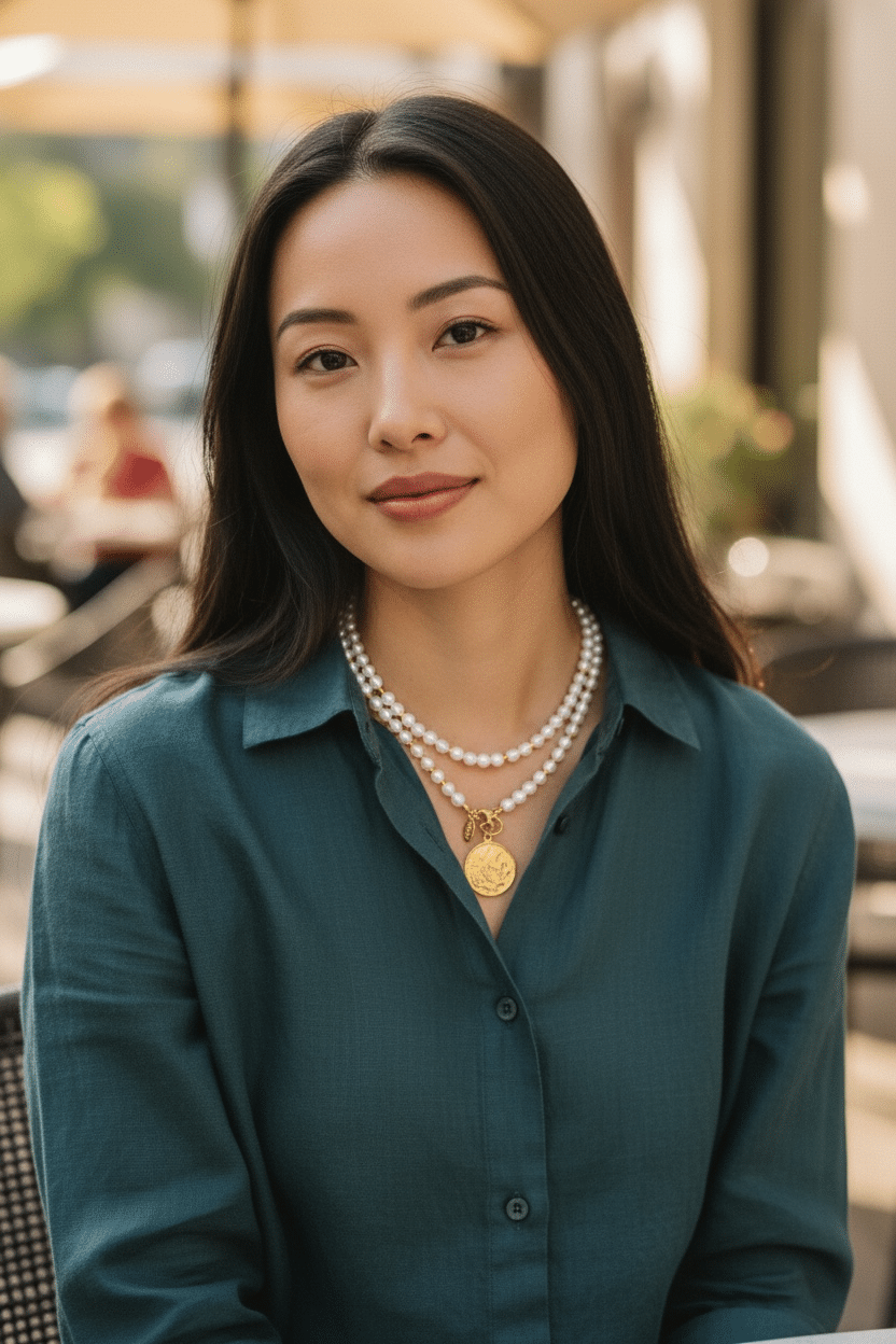 Wunderschöne mittellange Halskette aus echten Muschelkernperlen mit vergoldeten Eementen. Die Kette lässt sich in der Länge variieren und entweder als Y-Kette oder als Rundhalskette tragen