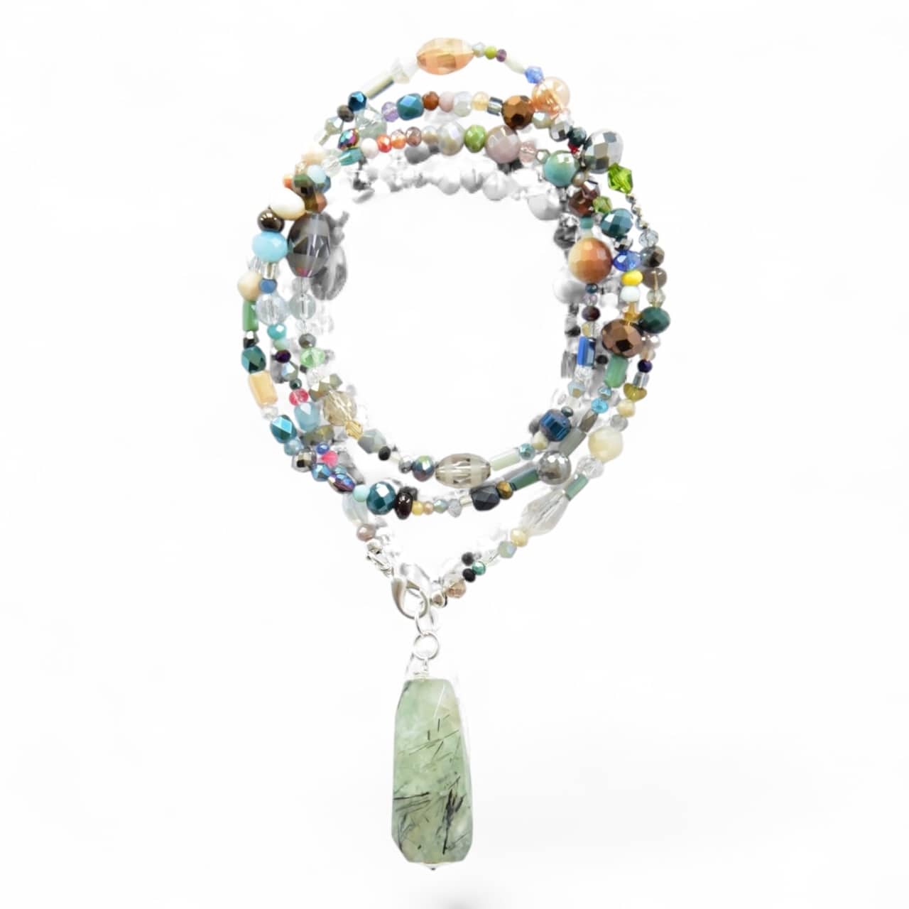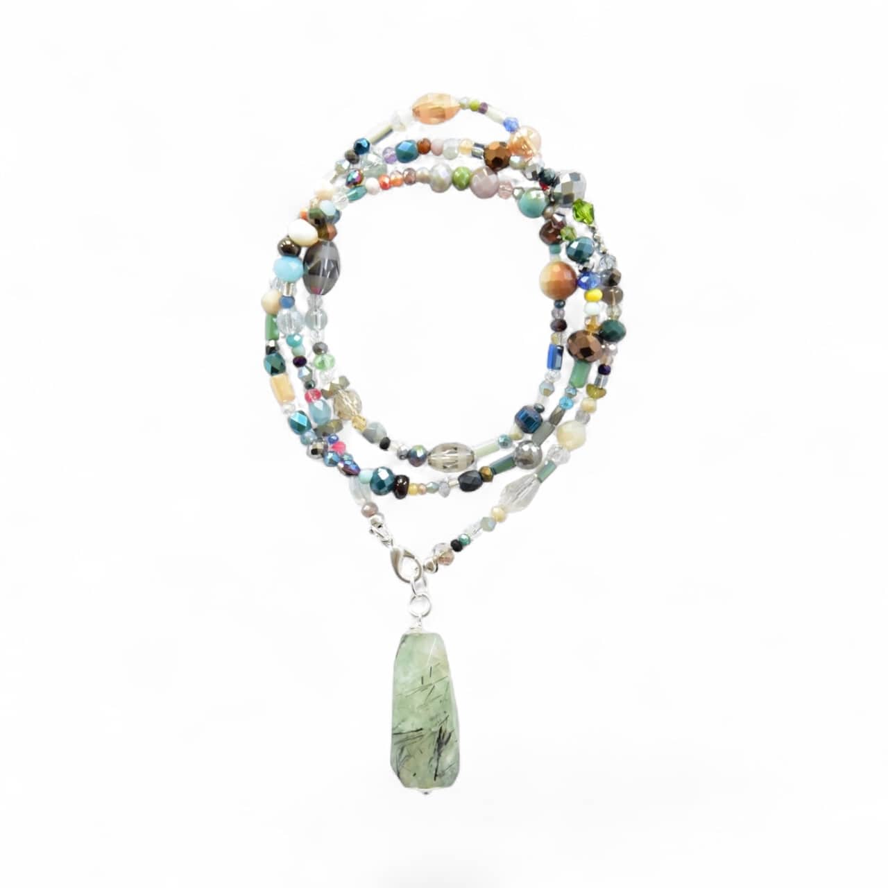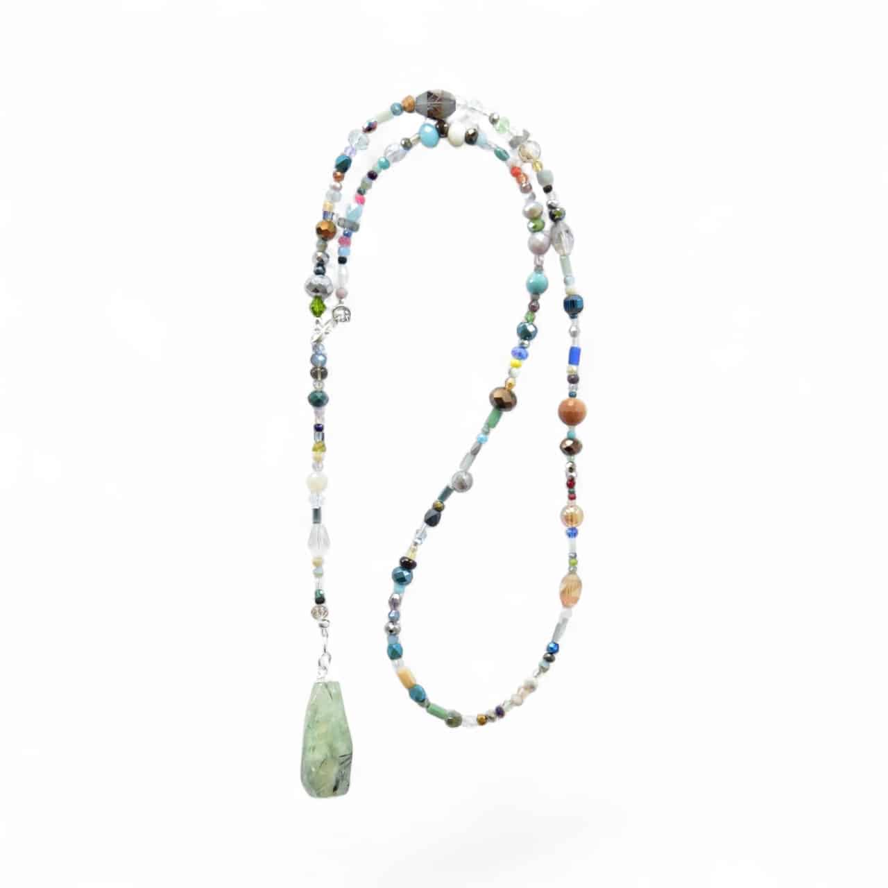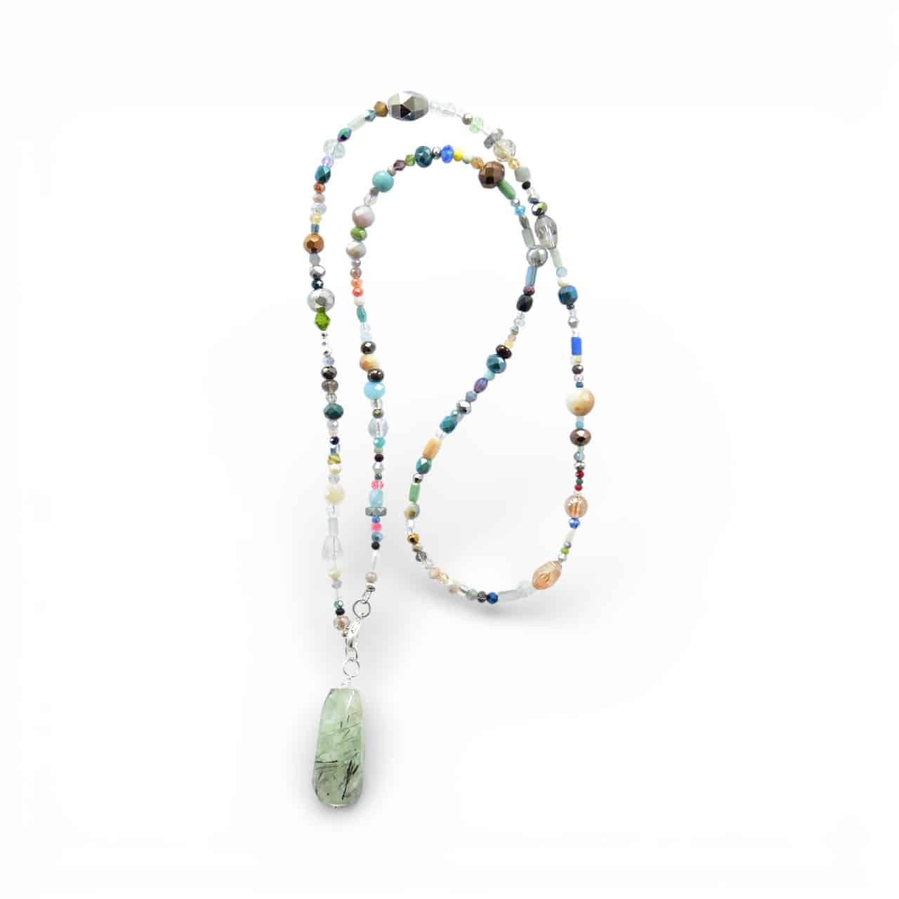 Lange Halskette aus vielen unterschiedlichen Glaskristallen und silbernen Hämatitrondellen mit kleinen farbigen Highlights endend in einm großen, kantigen Edelstein Tropfen.