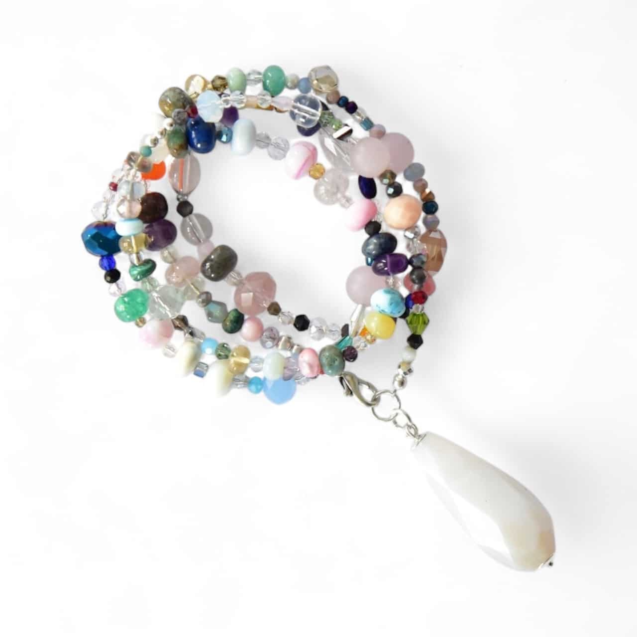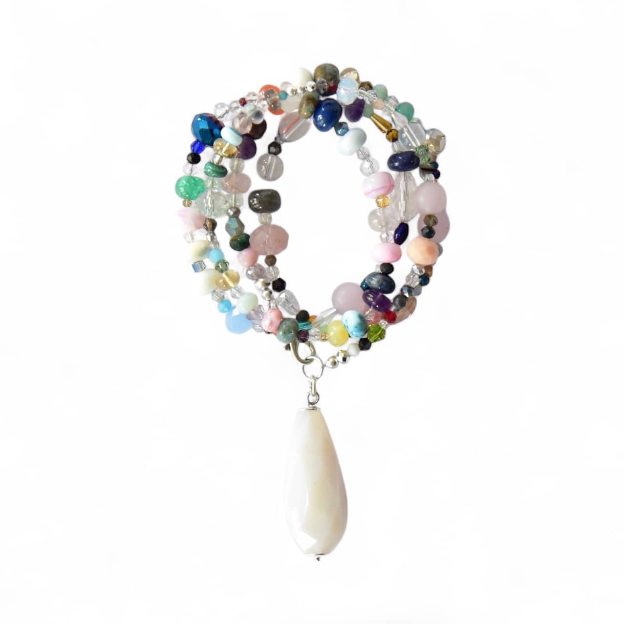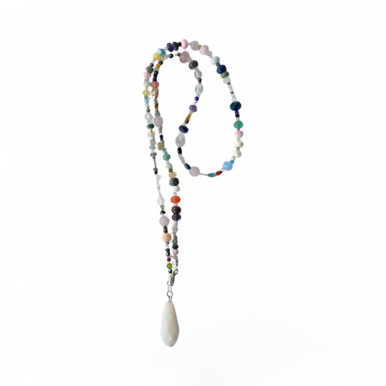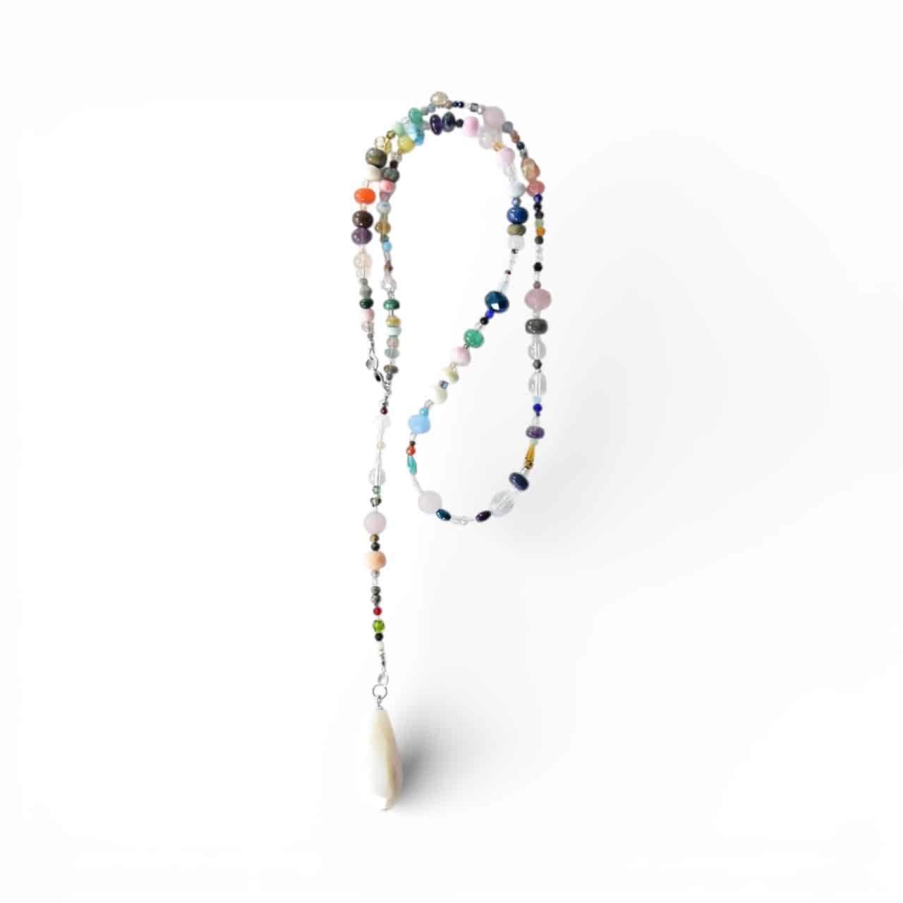 Lange Halskette aus vielen unterschiedlichen Glaskristallen und silbernen Hämatitrondellen mit kleinen farbigen Highlights endend in einm großen, kantigen Edelstein Tropfen.