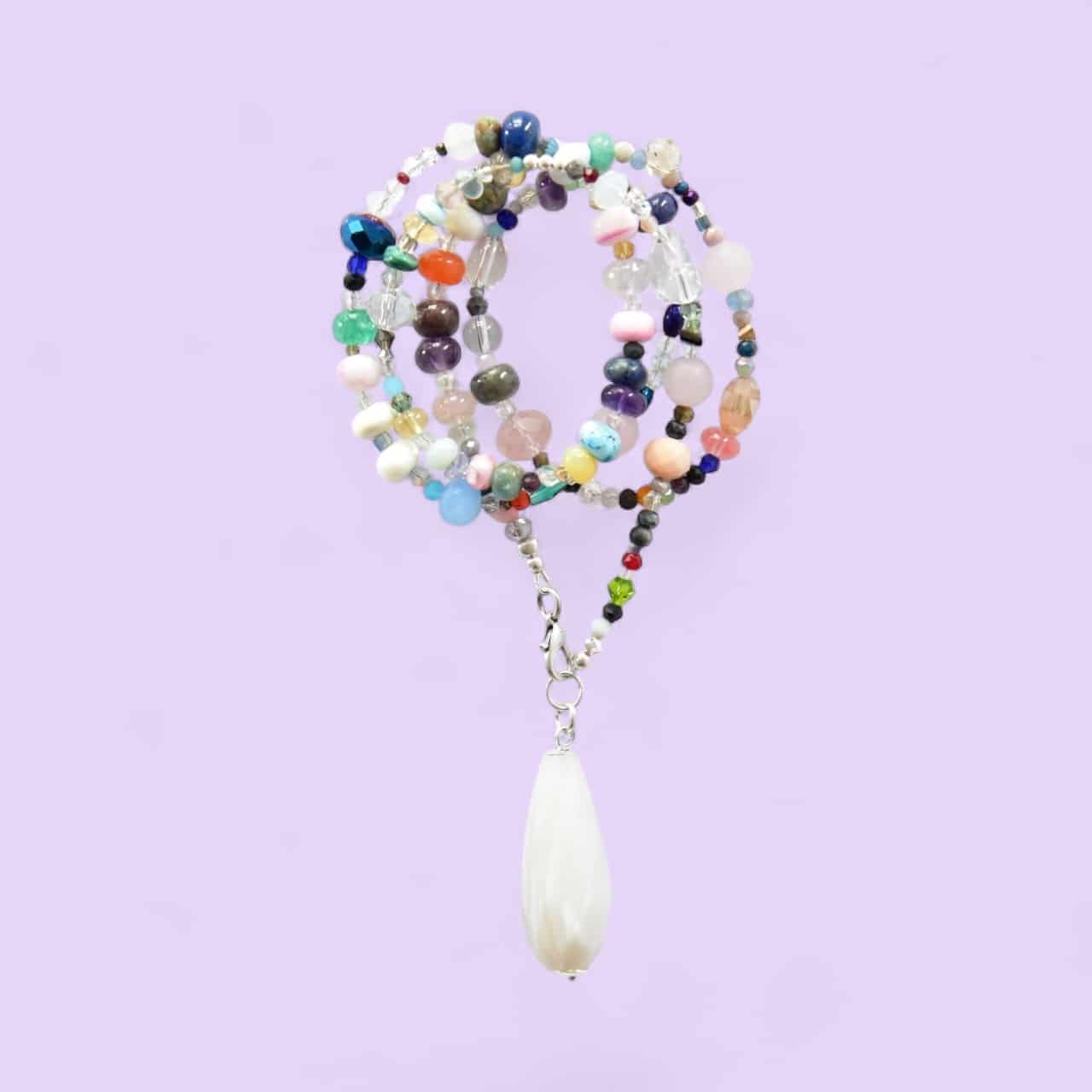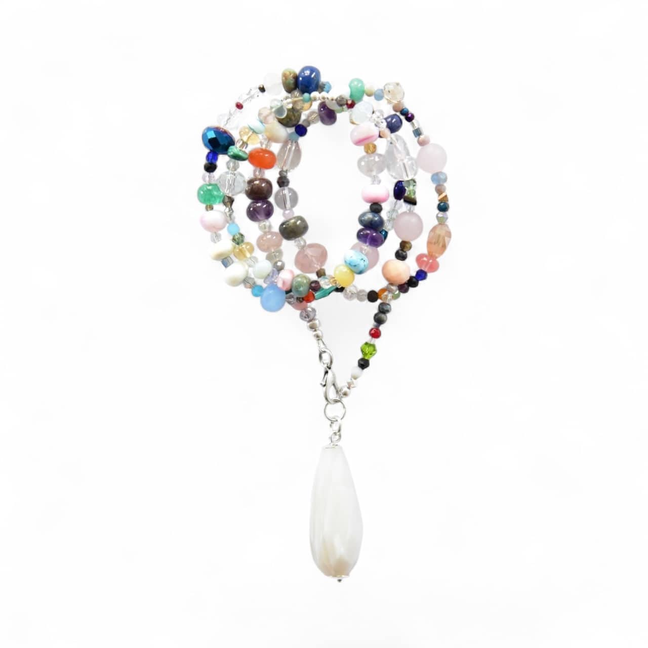 Lange Halskette aus vielen unterschiedlichen Glaskristallen und silbernen Hämatitrondellen mit kleinen farbigen Highlights endend in einem großen, kantigen Edelstein Tropfen.