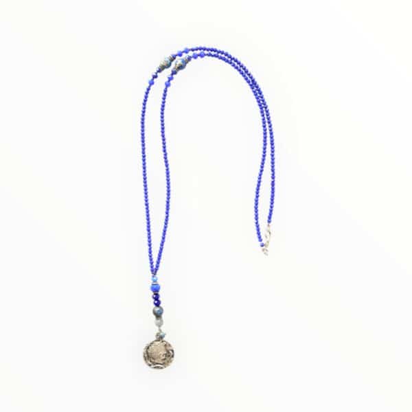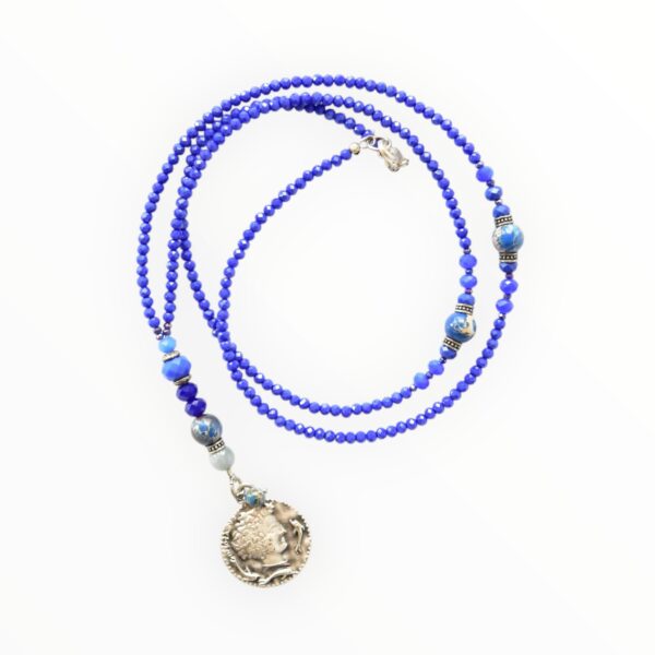 MUSTER Leuchtende Y-Halskette aus Glas mit Jaspis und versilberter Münze blaugrün