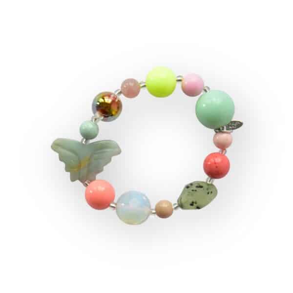 Material: Lackierte Harzkugeln, Schmetterling aus Amazonit, Rosenquarz, Phrenit, Opalith