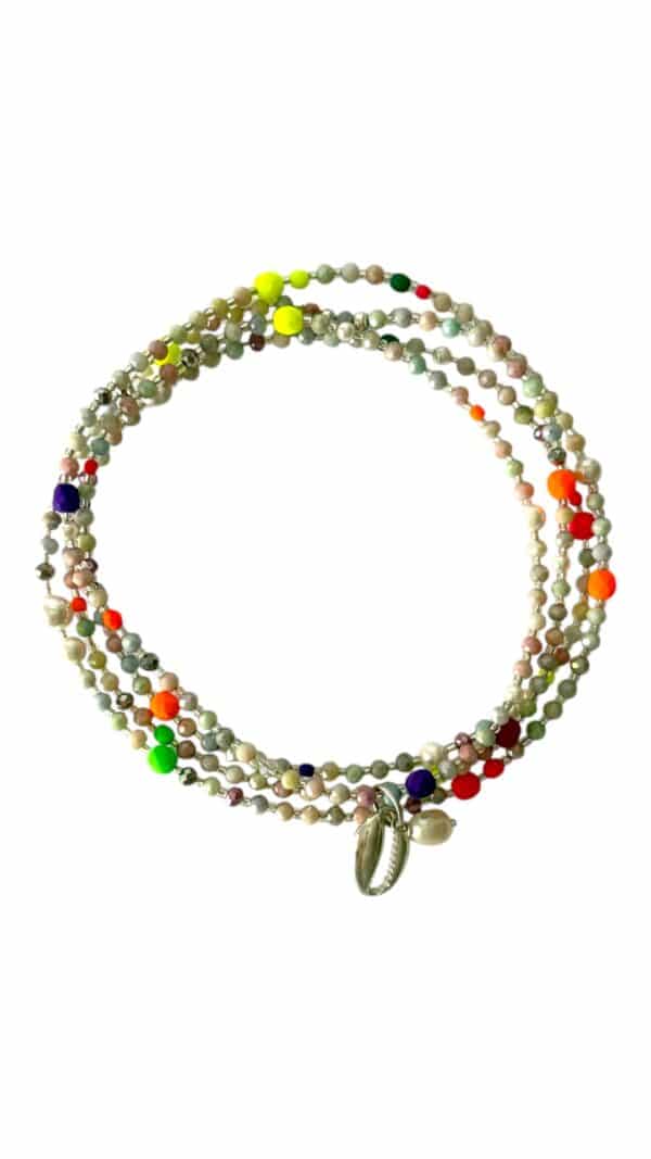 Diese Kette ist ein absoluter Style Kick für jedes Outfit. Schlicht und lässig in einem Stück kann diese Kette zwei bis dreimal gewickelt (BITTE NICHT KNOTEN) werden. Als dezentes Stilmotiv ist 1 kleine versilberte Muschel mit Perle eingehängt. Grundfarbe Pastell mit Hellgrau und Opque, Neon Lime Lila und Zitrone mit weißen Perlen und Kristall Miyuki. Aufwendig handgearbeiteter Perlenmix. Rundum OHNE Verschluss.
