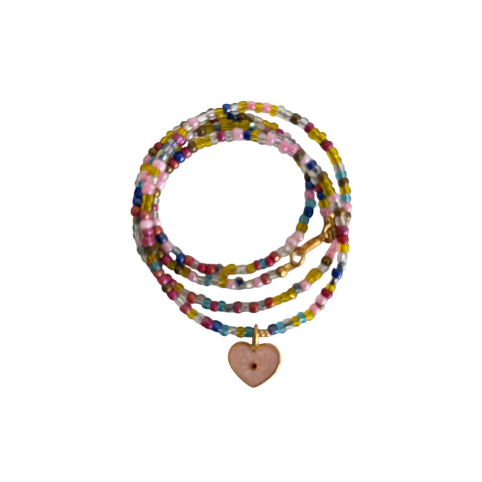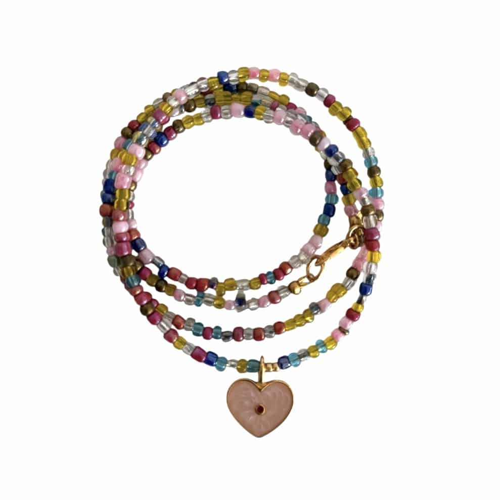 Stilvoller Hingucker aus farblich abgestimmten recycelten Glasperlen , sog. Miyuki Perlen mit einem vergoldeten Herz Medaillon in Rose. Die Halskette ist ein wunderbarer Eyecatcher und greift perfekt die Farben eines Outfits in Pastell und hellen Naturtönen.