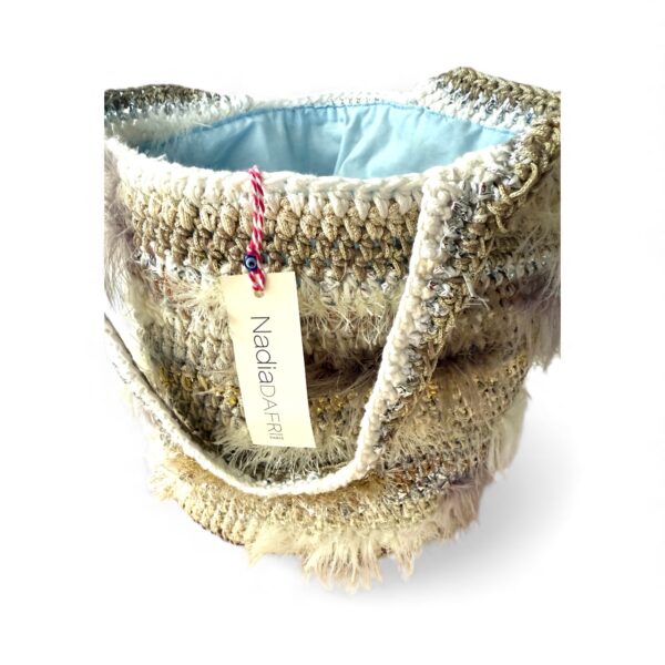 MODELL: ILKNUR Medium, Farbe Weiß, Beige, Gold , Silber, Hellgrau, Schokobraun, Lurex in Gold und Silber uvm. . Innenfutter Hellblau Handwerkstechnik: Häkel Maße: 38x30cm, Bden ca 26cm , Träger ca 46 cm LängeWarum du sie lieben wirst: