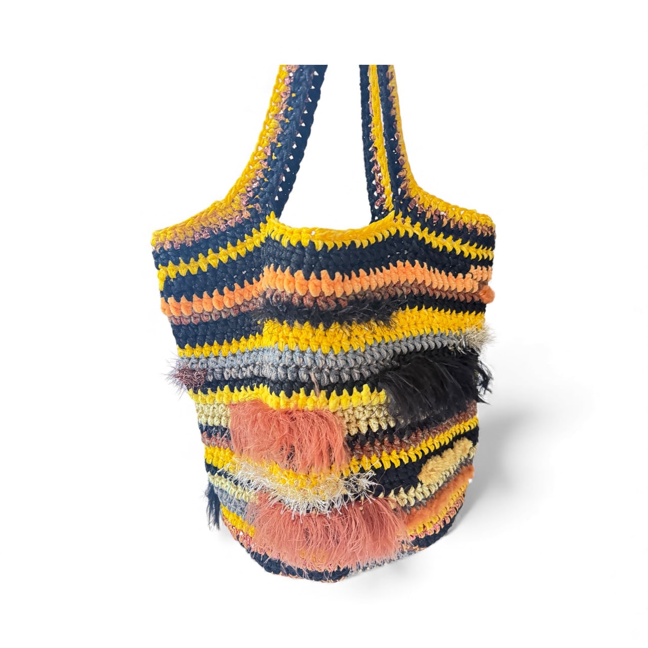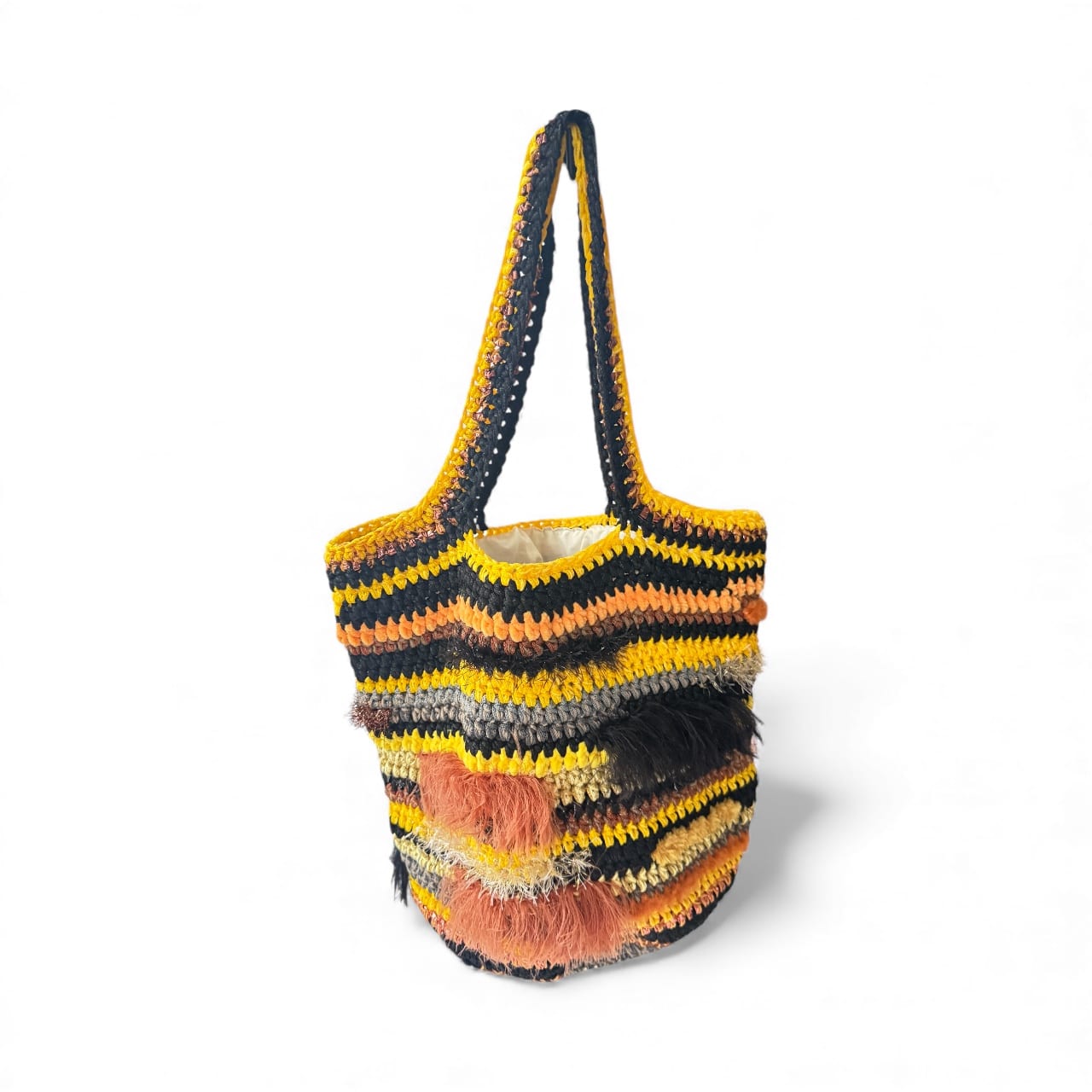 MODELL: ILKNUR Large, Farbe Schwarz, Rost, Grün, Sonnengelb, Schokobraun , Orange , Goldenes und Silbernes Garn, Schokobraun uvm. . Innenfutter Orange Handwerkstechnik: Häkel Maße: 46x50cm, Boden ca 26cm , Träger ca 55 cm LängeWarum du sie lieben wirst: