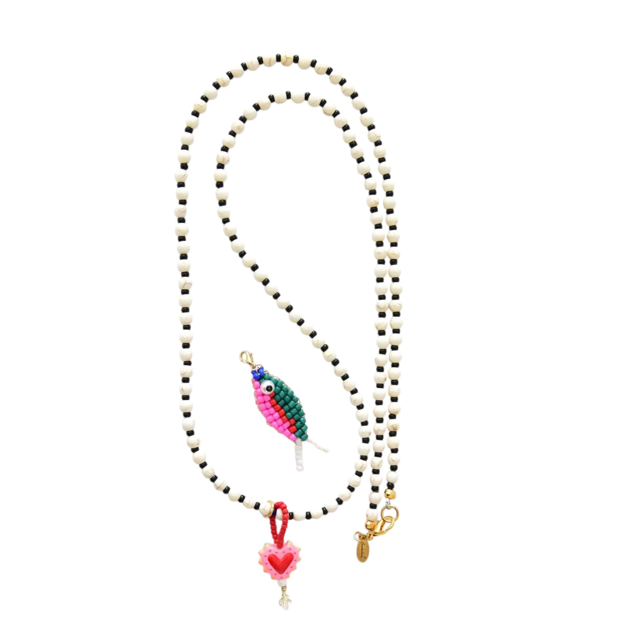 Im Mittelpunkt stehen ein filigran gefädelter Fisch aus Rocailles sowie ein Herz aus glänzendem Kunstharz – zwei Symbole, die Leichtigkeit, Emotion und Bewegung vereinen. Der ruhige, marmorierte Howlith bringt eine natürliche, sanfte Optik in das Design, während die schwarzen Perlen einen modernen Kontrast setzen.