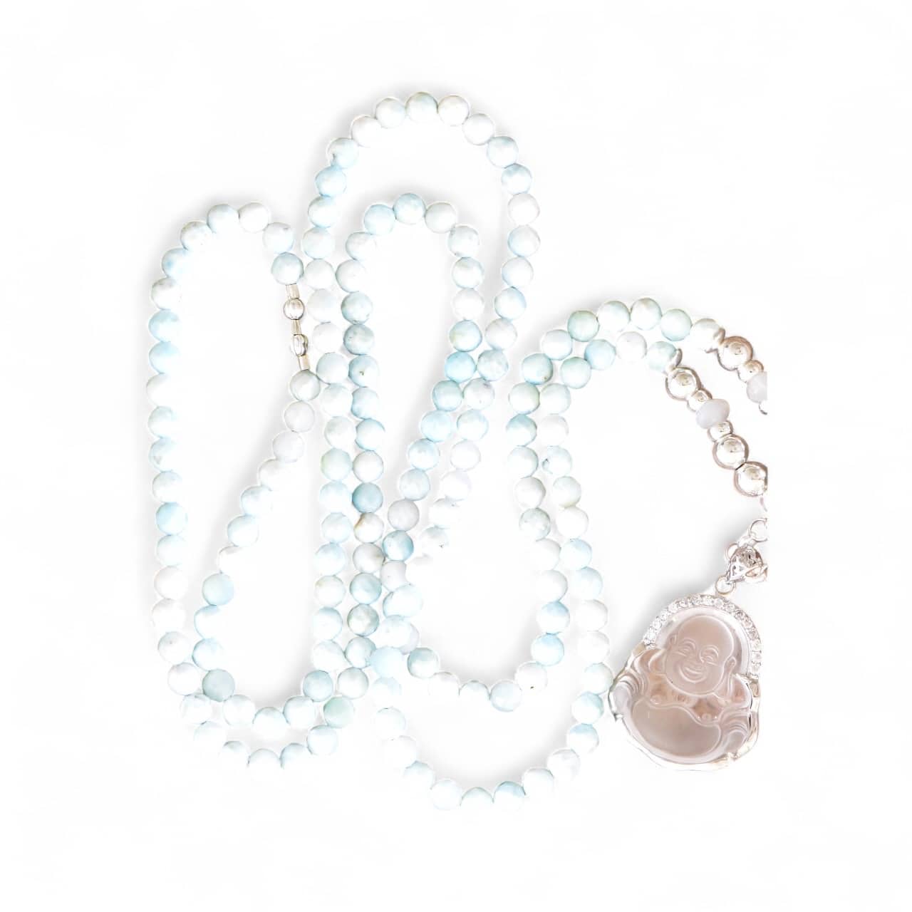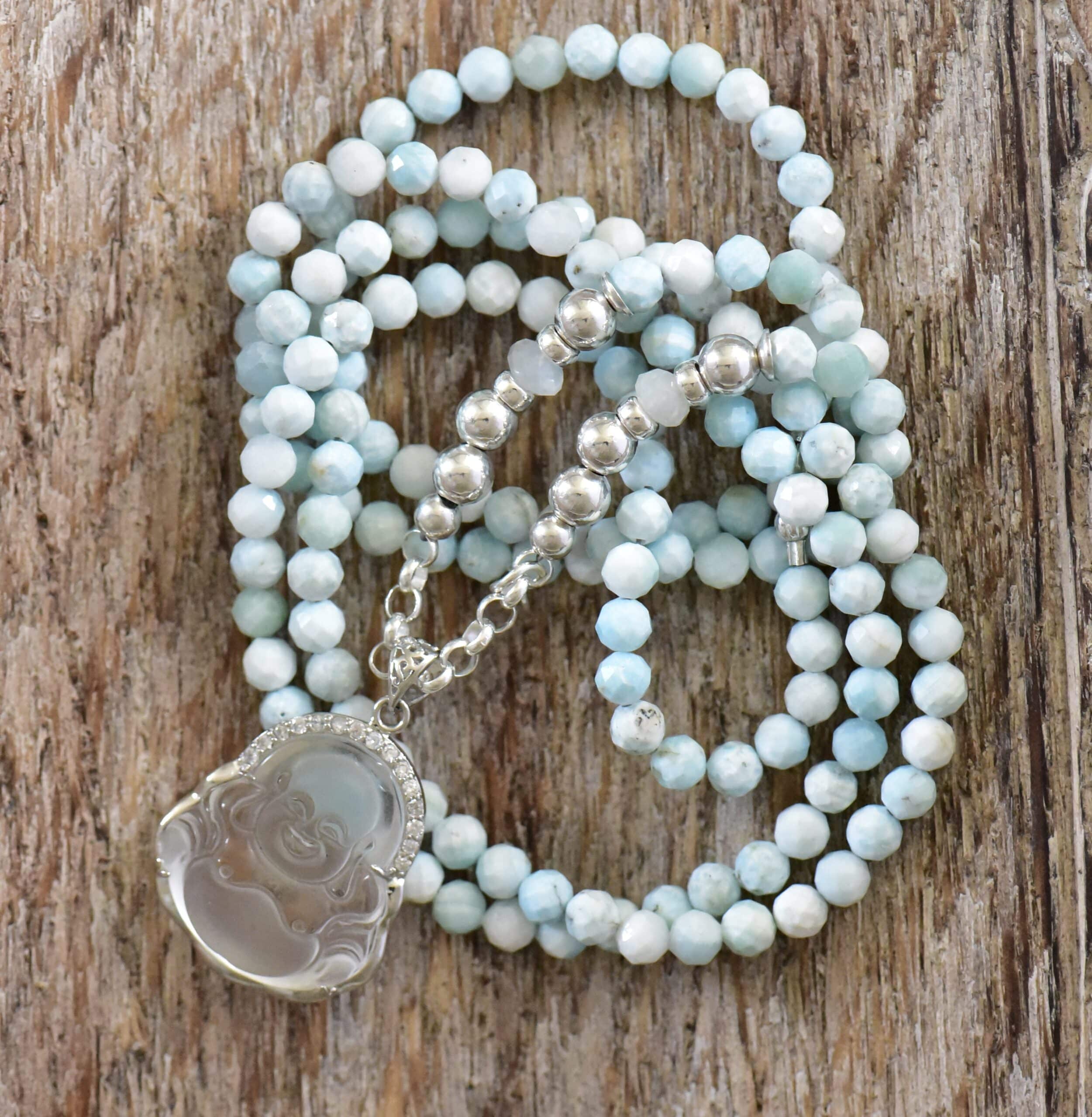 One of a kind `Einzelstück – Kette Larimar mit Bergkristall Buddha, Silber, Zirkonia