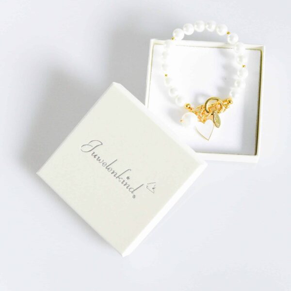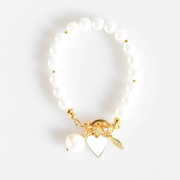 Ein Herz sagt mehr als viele WorteTraum Armband aus weißen Muschelkernperlen, Silber vergoldet sowie vergoldetem Toggle Verschluss und zauberhaftem Herz Anhänger in weiß oder wahlweise in rot, aus hochwertiger Emaille, kombiniert mit einer großen Biwaperle alle Metallelemente sind vergoldet. Dieses Armband wird in einem Satinbeutel zum Verschenken versendet.