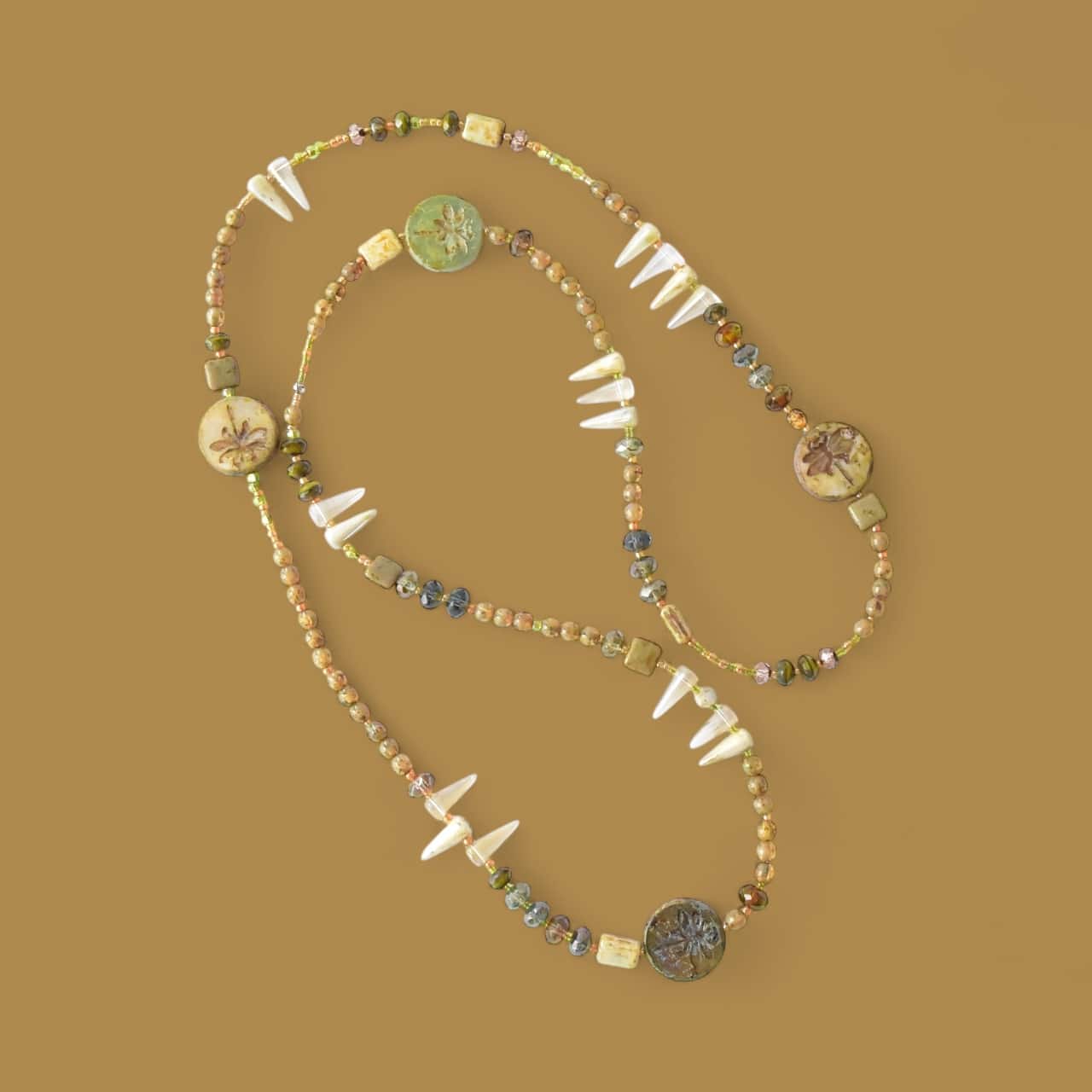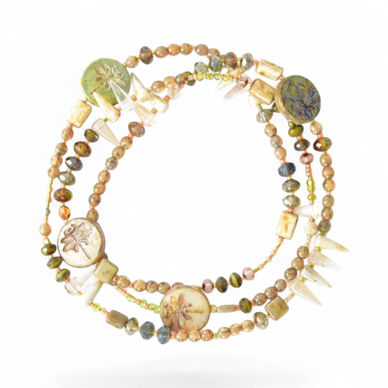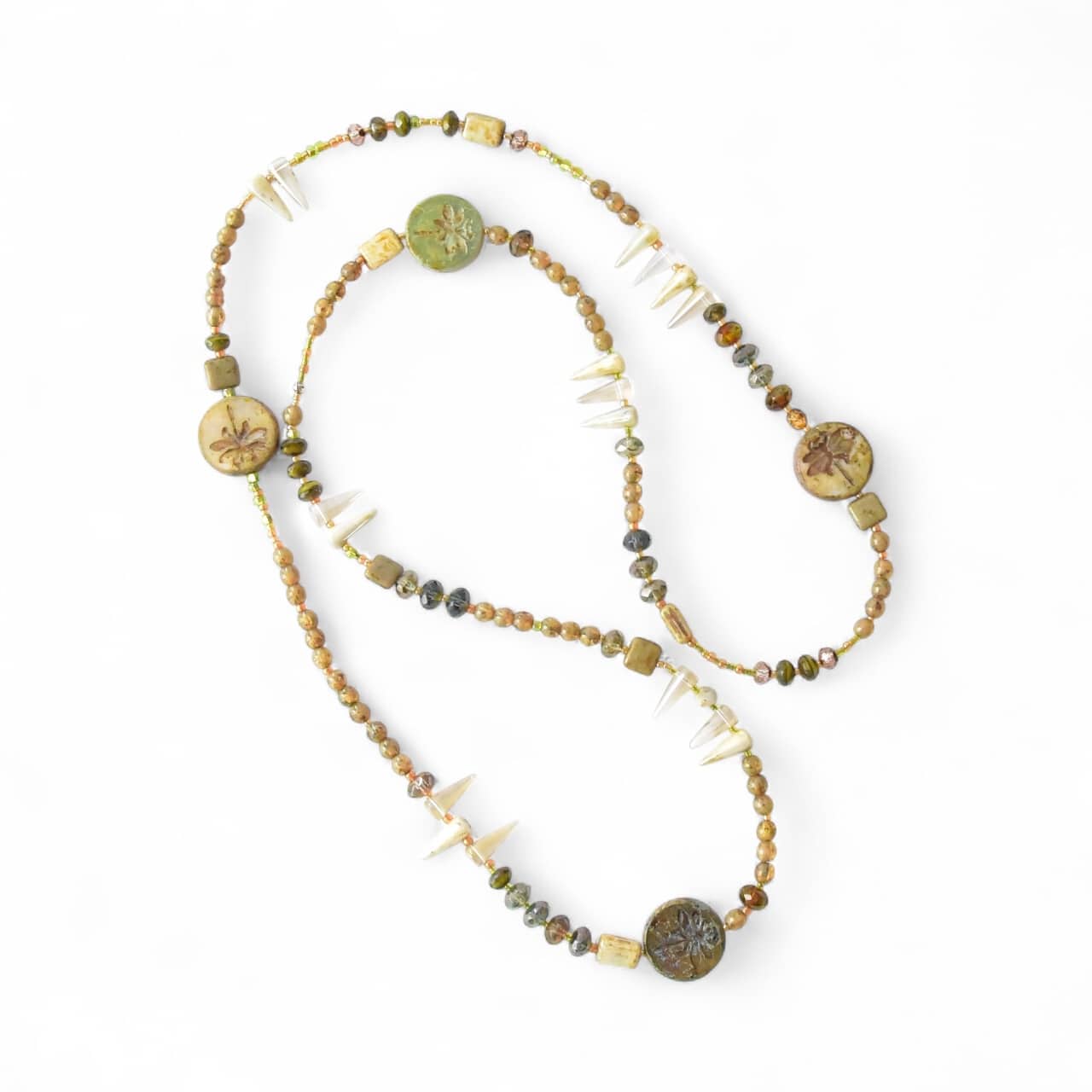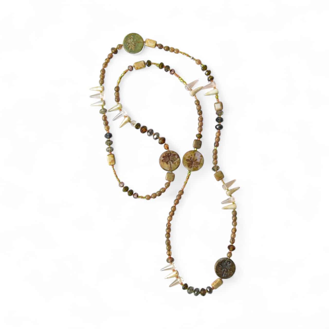 Rundhalskette mit Böhmischen Glasspikes und Original böhmischen „Dragonfly“ Perlen aus gepresstem Glas . Jede Perle ist handgearbeitet und hat eine eigene Farbgebung. Mit böhmischen Glasperlen in Edelsteinoptik und japanischen Miuki. Die Kette ist Olivgrün braun marmorierte .