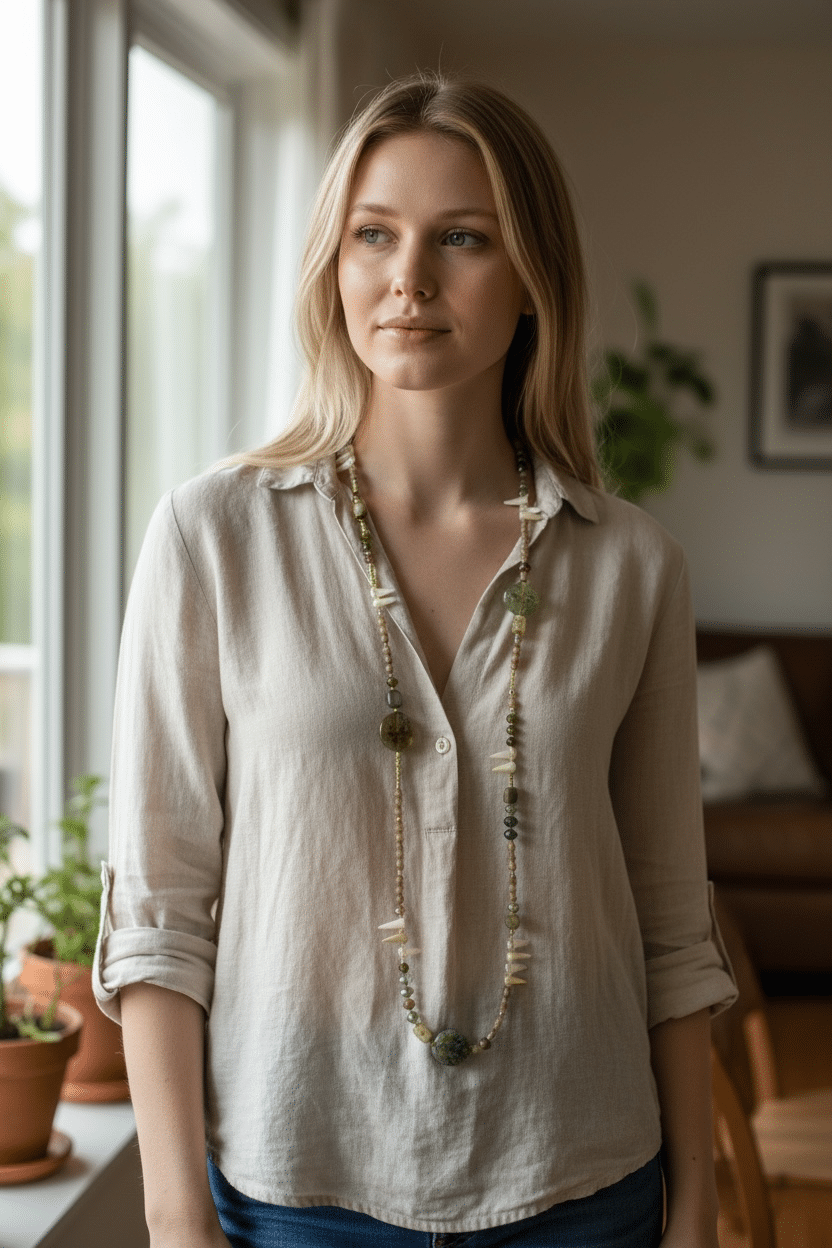 Bei dieser Halskette wollten wir ein Schmuckstück kreieren, das sich vielfältig jeden Tag als lässiger Blickfang zu allen Kleidungsstücken lässig stylen lässt. Das besondere bei der Halskette Modell "Cleo" ist die Möglichkeit, eigene Anhänger beliebig ein und auszuhängen, da die Kette einen Karabiner Wechselmechanismus hat. Die Materialien sind zeitlos, Taupe farbene Glasschliffperlen, Sterlingsilber, Hämatit und eine schöne silberne Münze mit Cleopatra Antlitz zum Wenden. Länge 104cm, Anhänger Münze, ca 3cm, Kette lässt sich doppelt gewickelt kurz tragen. Wer es zB. lieber Grau oder Schwarz mag, Halskette Cleo haben wir in verschiedene Farben im Sortiment!