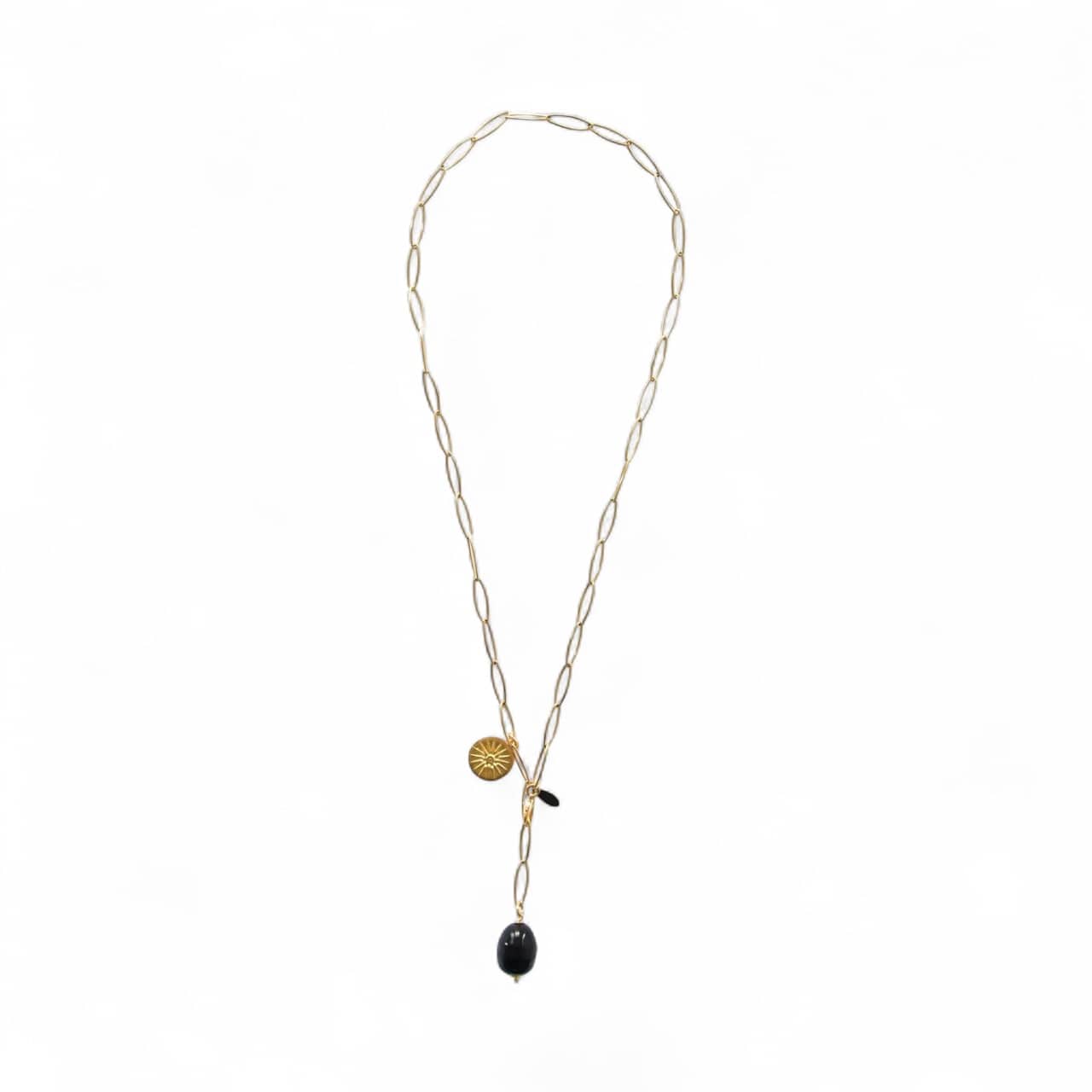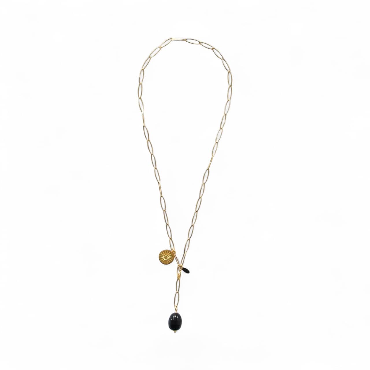Schwarzer Tropfen Vergoldete Edelstahl Gliederkette „NIKA“ Gold Exklusiv mit vergoldeter Sonnenmünze Muschelkerntropfen