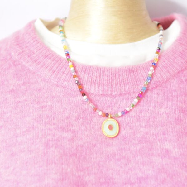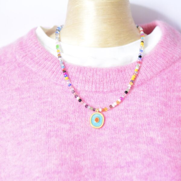 Bunte Kurzkette Glasschliffperlen mit emailliertem Medaillon, vergoldeter Anhänger