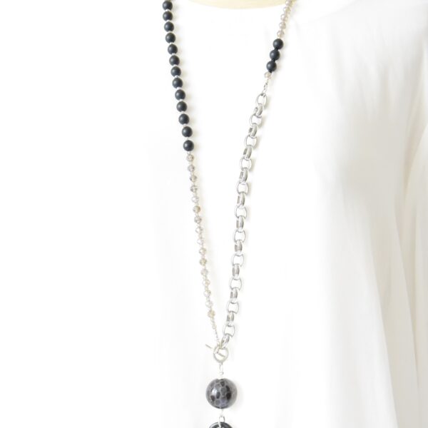 Wunderschöne lange Halskette aus einem matten Onyx, kombiniert mit dunklem durchsichtigen Kristall und einer versilberten Edelstahlkette . Besonderer Blickpunkt sind ein schwarzes Echthorn Element und eine echte Lederkugel, welche aufwendig in Acryl laminiert wurde. Die Kette hat einen stylischen Toggle/Knebelverschluss, welcher sich beliebig in die grossgliedrige Kette einhaken lässt . So lässt sich die Kette jederzeit in der Länge und im Style variieren und entweder als Y-Kette oder als Rundhalskette (auch doppelt gewickelt) tragen. Viel Freude beim Stylen! Länge: rundum 86cm, plus 10 cm Anhänger Zeitlose Materialien, matter Onyx, Kristallglas , Lederperle, Horn OrnamentY – Halskette , schwarzer Onyx mit Horn Paece
