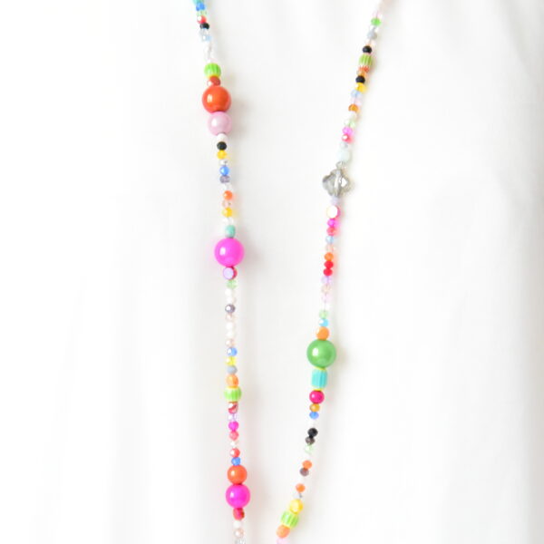 Diese Bettelkette aus buntem Glas mit Miracle Beads und Millefiori Glas ist ein wahrer Farbenrausch und ein außergewöhnliches Schmuckstück. Ihre leuchtenden Farben und kunstvollen Glasperlen machen sie zu einem Blickfang, der jedes Outfit aufwertet. Trage diese Bettelkette und lass dich von ihrer einzigartigen Schönheit und Handwerkskunst verzaubern.