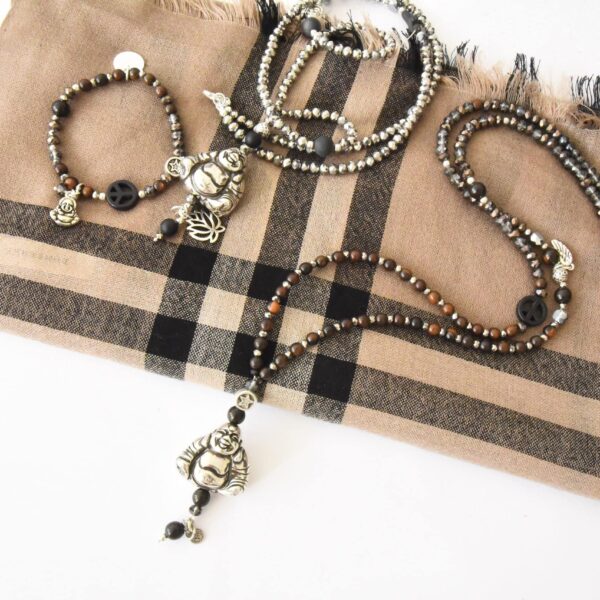 Armband „Saratoya“ in dunkelbraun schwarz, aus Ebenholz mt Happy Buddha
