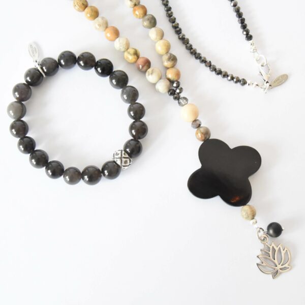 Y Halskette mit braun beige Jaspis, Obsidian und Kristallperlen Horn Blume
