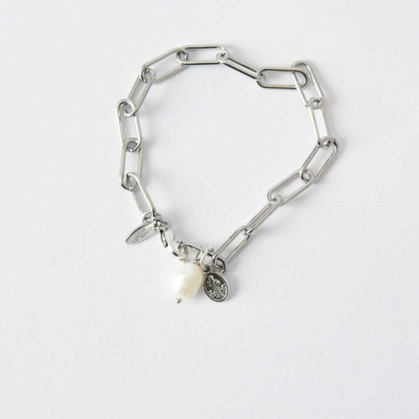 NIKA Paperclip Armband Edelstahl in Silberfarben mit kleinem Charm und weißer Zuchtperle Perle