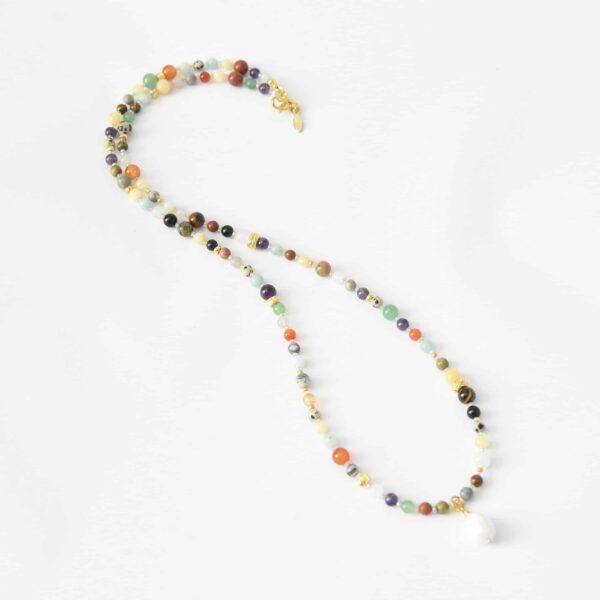 Bitte beachten: Diese wie alle unsere Ketten werden in unserem Atelier in Handarbeit gefertigt, Ketten mit einem Mix aus Steinen gleichen daher nie einer der anderen. Weitere abgebildete Accessoire dienen der Inspiration und sind nicht im Angebot enthalten.