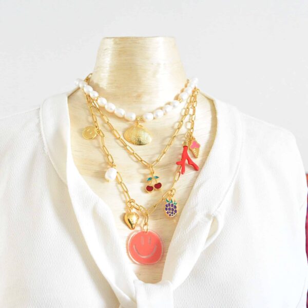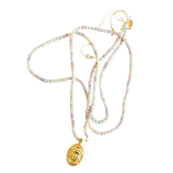 Stilvoller Hingucker aus farblich abgestimmten recycelten Glasperlen , sog. Miyuki Perlen  mit einem vergoldeten Medaillon . Die Halskette ist ein  wunderbarer Eyecatcher und greift perfekt die Farben eines Outfits in Pastell und hellen Naturtönen. Material:   farblich abgestimmtes receyceltes Glas Länge ca 84cm, Farben Kristall, Hellblau, Rosa, Himbeer, Amulette in Orange mit  Farbpunkt in Berry Bitte beachten: Diese wie alle unsere Ketten werden in unserem Atelier in Handarbeit gefertigt, Ketten mit einem Mix aus Steinen gleichen daher nie einer der anderen. Weitere abgebildete Accessoire dienen der Inspiration und sind nicht im Angebot enthalten