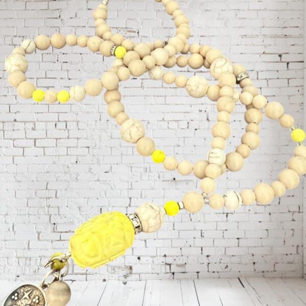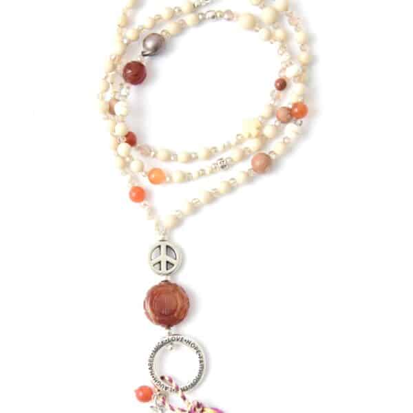 Edle Bettelkette  aus  beigem Jaspis, kombiniert mit Rosenholz und rotbraunen Karneol Halbedelsteinen. Länge rundum ca 80 cm , plus ca 12 cm Anhänger . Mit versilbertem Spruchring Material: Jaspis, Karneol, Holzperlen,versilberte Metalzierteile Naturmaterielien: kleine Varianzen in Farbe und Form sind naturgemäß und gewollt.