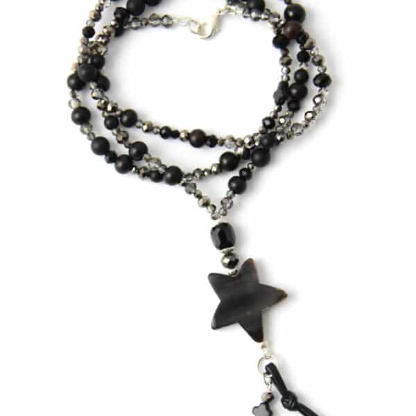 Edle Bettelkette  aus  schwarzen Onyxkugeln , facettiertem Glas und Sternen aus Echthorn, Anthrazitfarbener Lederschlaufe. Länge rundum ca 80 cm , plus ca 12 cm Anhänger . Material: Jaspis, Karneol, Holzperlen,versilberte Metalzierteile Naturmaterielien: kleine Varianzen in Farbe und Form sind naturgemäß und gewollt.