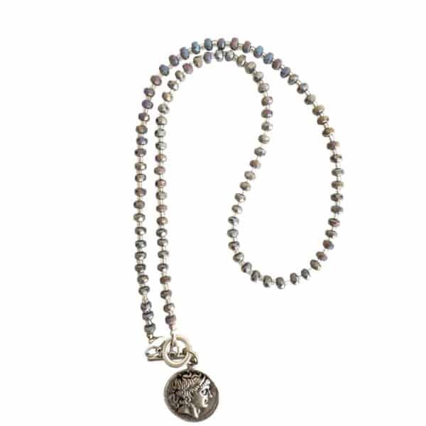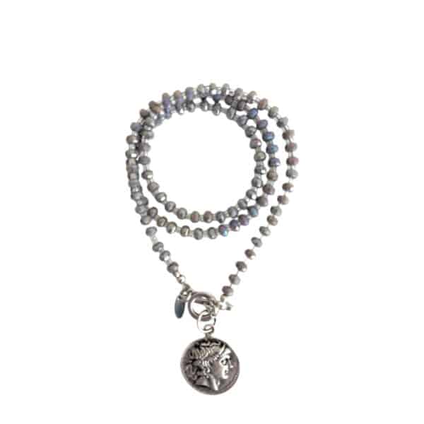Halskette Kristall und Glasschliffperlen in hellblau/grau (Blickdicht). Mit einer zeitlosen versilberten  Münze und dekorativem Knebelverschluss welcher vorne getragen wird. Zeitlos und stylisch zugleich. Geschlossen wird die Kette vorne mit einem hochwertigen Knebelverschluss.