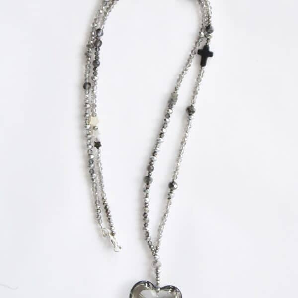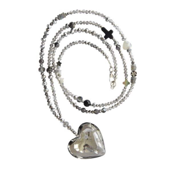 Lange glitzernde Halskette aus facettierten Glasschiffperlen in Silber und Black Diamond, mit Zwischenteilen aus Perlmutt, Labradorit, und Onyx . Extralang und superlässig, endend in einem großen grau silbrig gänzendem Kristallherz. Farben schwarz, Durchsichtig grau, Silber. Peppt edel glitzernd jedes Outfit auf. Materialien: Kristallglas, Perlmuttherzen und Sterne, Labradoritscheiben, und Onyx Länge ca. rundum 100 cm, Anhänger Hert ca 4cm Viel Freude beim Stylen!