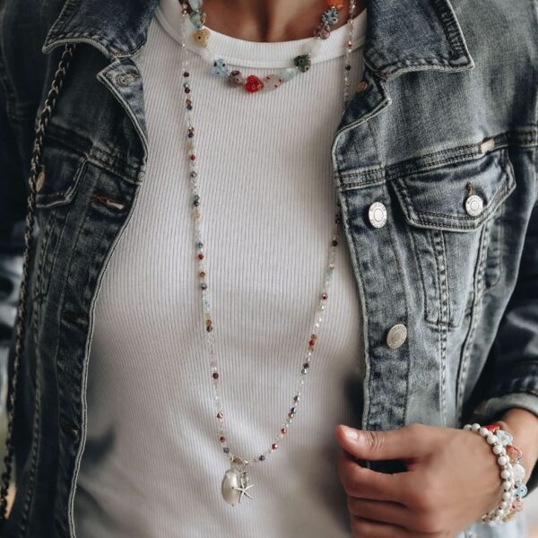 Verspielte Bettelkette aus kleinen aneinander gereihten Glas Dreiecken in durchsichtig, rothellblau, Zitrone uvm. Ein zauberhafter Blickfang. Die Anhänger bestehen aus einer edlen echten Barockperle unregelmäßig gewachsen, kleinem versilbertem Seestern und Fisch Anhänger.